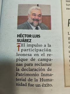 Mi amigo y Hno. Martín me remite esta valoración de Diario de León de hoy 22 de Abril de 2018. Un detalle del periódico que, en lo personal, agradezco profundamente a tantos amigos que trabajan en el Diario. Pero que, desde lo que toca al evento campanil en cuestión, sería totalmente injusto por mi parte si no fuera compartido sin protagonismo alguno. En concreto, si no fuera compartido además de con todos los campaneros y aquellos que han hecho posible los toques - desde el que abre la puerta del campanario, hasta el que en una junta de asociación dio su visto bueno a la participación y el que registró imagen y sonido, sin olvidar a los medios de comunicación que han registrado el hecho y dado noticia divulgándolo - con otros amigos y aficionados a las tradiciones y al entorno de las campanas que, tanto y en tan reducidísimo tiempo, se han implicado en el asunto a modo de coordinadores ocasionales y vocacionales, auténticos "enredabailes" entrañables del resto. Como, entre otros de modo destacado, Melchor Moreno - alrededor del germen inicial de Santa Marina de Torre -, Paz - de raices maragatas, desde Hispania Nostra- los omañeses Luis Arias, Chelo Fernández, Loli Rodil y José Mª Hidalgo; Amador Pinos y el Ayto. de VIllarejo de Órbigo; el de Encinedo y su alcalde - desde el campanario de La Baña, con ayuda de su boticario -, el Sobarribeño Antonio Barreñada; Bodega en Fresno, Oscar Herrero Holguera - cofradía de la Expiración y el Silencio -, Hermenegildo López- por la cofradía del Milagroso Pendón y artífice de la inclusión de San Isidoro en el proyecto -, Paco Figueroa - fundamental junto a los terciarios y cofradía del Cristo, en Villafranca -, David "Pacho" - Asociación "La Brusenda" en Felechas - además de los campaneros ilustres de las escuelas de campaneros como Jorge Juan - por la escuela de VIllabante - Pedro Delgado - escuela de Villabalter - y Blas Cubelos - desde su homóloga de Campo, o en tierras zamoranas Joaquín Alonso; Vicente Carbajal - de Sofcaple que se encargó del intento de dinamizar su área de Sahagún -, el cabildo de San Isidoro y las comunidades benedictinas y capuchinos de León, la Catedral de Astorga, Basílica de La Encina, Santuario del Ecce Homo de Bembibre y tantos otros más donde se halla cada pequeño pueblín y campanario además de aquellos que no pudieron sumarse por diverso motivo tras intentarlo. Mil disculpas a los que he olvidado citar.